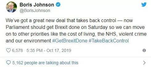 当天,英国首相约翰逊在社交平台上表示:“我们已经达成一项伟大的协议”,并呼吁英国立法者支持该协议。