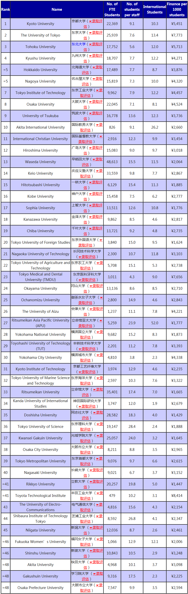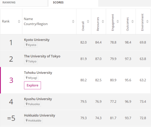 2018年的该排名中,日本第一院校由东京大学及京都大学并列获得,不过今年的榜单京都大学险胜,以0.1分之差获得第一。