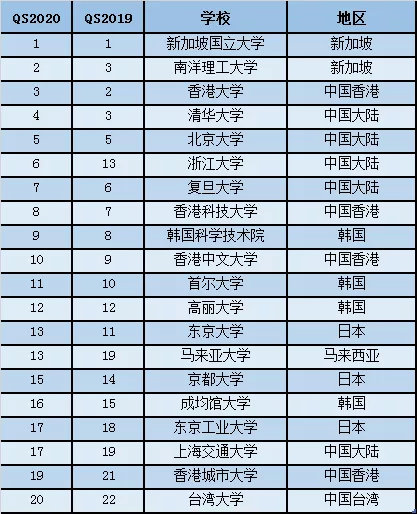 说完了评价标准,下面让我们具体来看看2020年QS亚洲大学排名有何变化:
