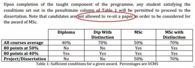 2. 如果论文挂了,就与硕士学位无缘了,因为明文规定“not allowed to re-sit a paper”(不能够“重写”论文)。但也有特殊情况,遇上比如亲友过世这类的重大变故,造成论文失利,也许可以找学院商议,再次提交论文,但仍旧机会渺茫。