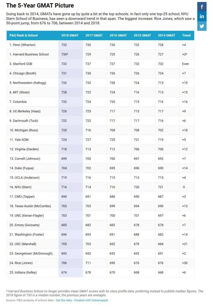 从最近的2018年数据上来看,前25名中有6所学校的GMAT成绩逐年下降,15所学校的GMAT成绩有所上升(平均上升3.1分),3所学校持平。前十名中涨幅最大的是哥伦比亚大学(从724分升至732分)和麻省理工学院斯隆商学院(从722分升至728分)。