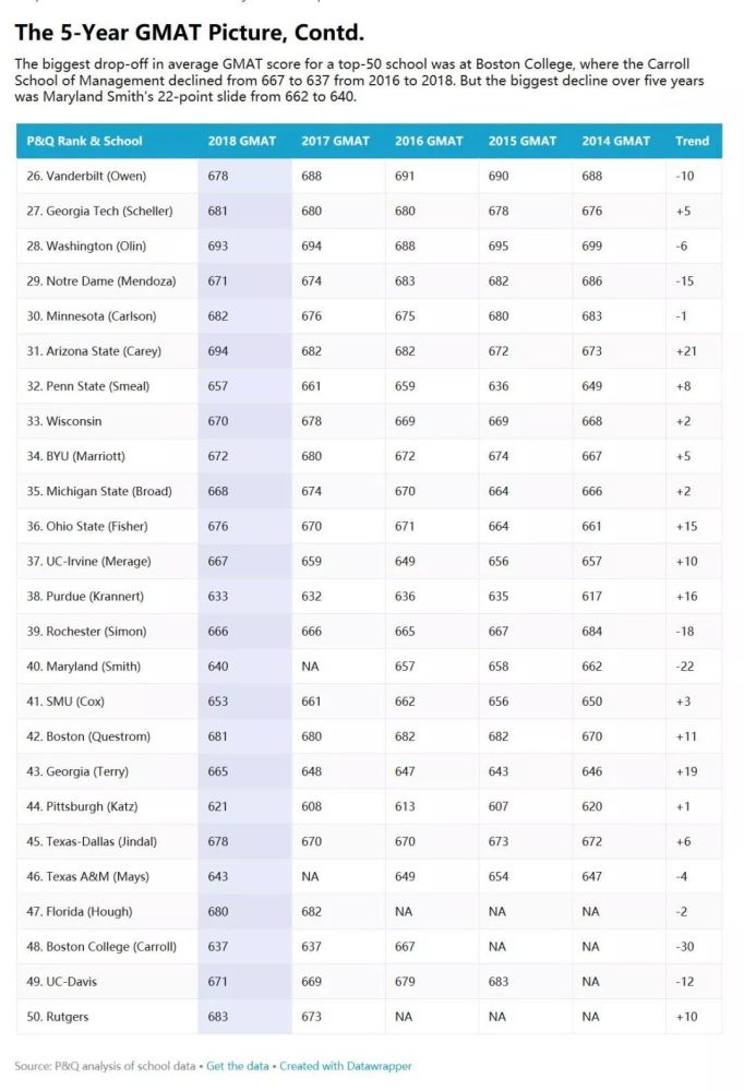 除了分数不断涨幅的学校之外,有11所学校在过去5年间出现了下降趋势。其中马里兰大学史密斯商学院的降幅最大,从662分降至640分。其他降幅的学校主要有罗切斯特大学西蒙商学院(从684分降至666分)、圣母大学商学院(从686分降至671分)以及范德堡大学欧文管理学院(从688分降至678分)。