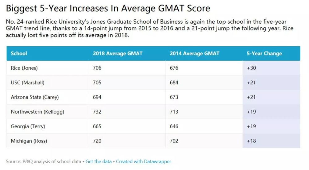 从数据中看出,涨幅最大的商学院是莱斯大学琼斯商学院,以涨幅30分排在榜首。紧跟其后的是南加利福尼亚大学商学院(从684分升至705分)、亚桑那州立大学商学院(从673分升至694分)。