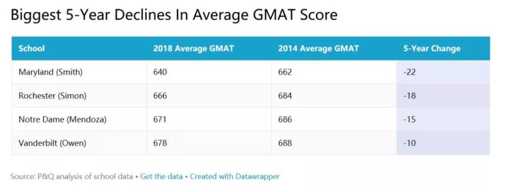 GMAT成绩在5年内降幅最大的商学院: