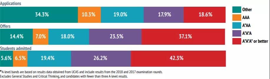 - 过半申请人以及90%以上的录取者的A-level分数达到A*AA或更高;