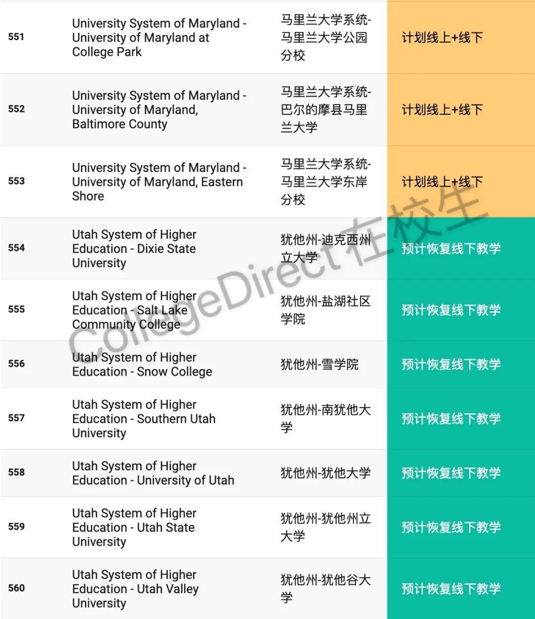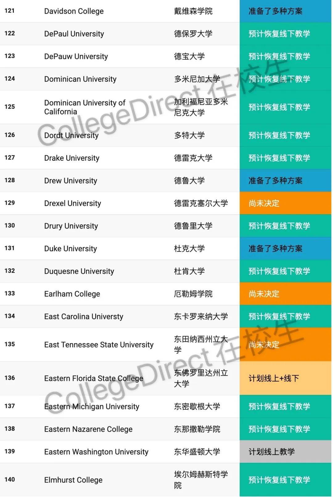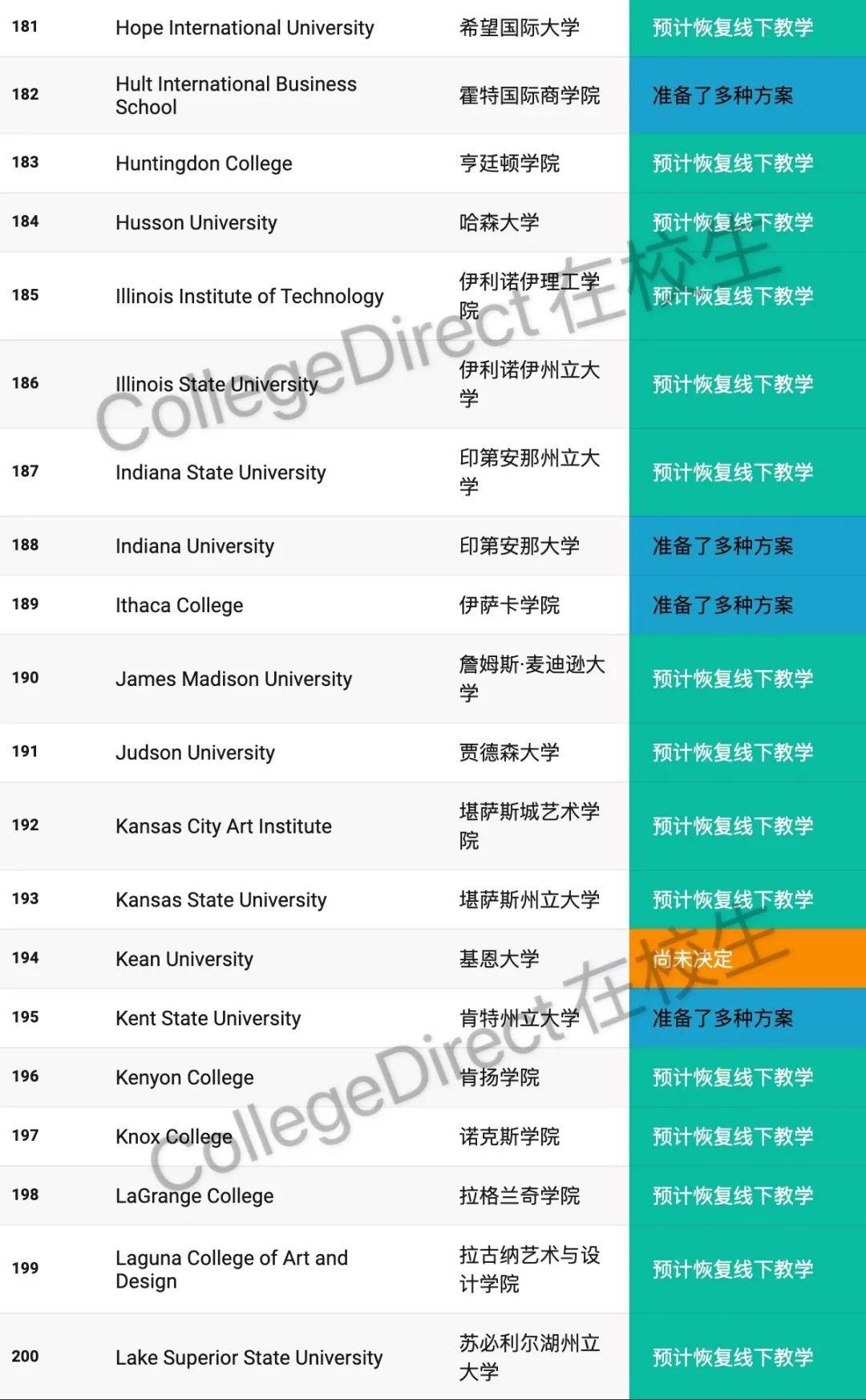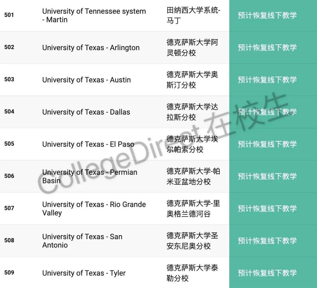 598所美国大学2020年秋季开学计划