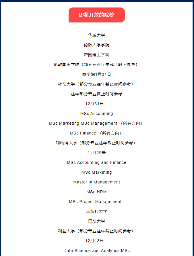 接下来我们来看看,目前已经开始申请的院校,以及即将开放申请通道的院校,还有往年截止时间提醒,有需要的同学可以把握好时间节点来进行申请。