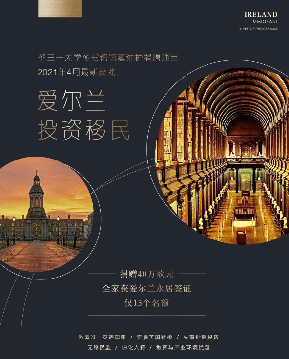 捐赠40万欧元到已获批的都柏林圣三一大学图书馆馆藏维护捐赠项目,仅15个名额。爱尔兰最高学府,与牛津剑桥齐名;投资人家庭将有机会与圣三一大学的领导和学者进行更多互动,与这所世界名校结缘。已获批项目,无拒签风险!