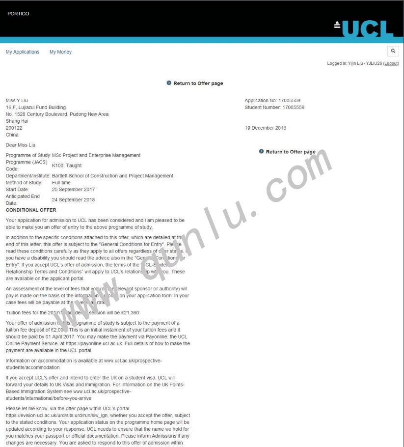 • 录取结果: University of Manchester;UCL