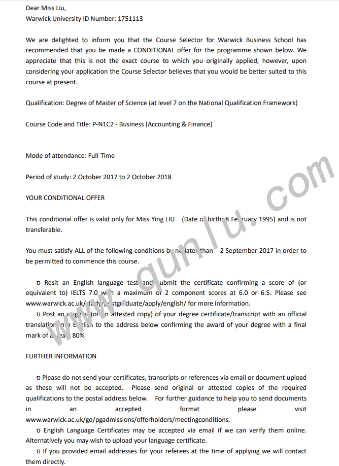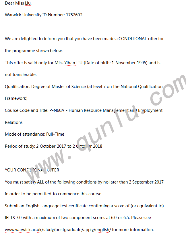 • 恭喜刘同学获得University of Bath 和 University of Warwick的offer