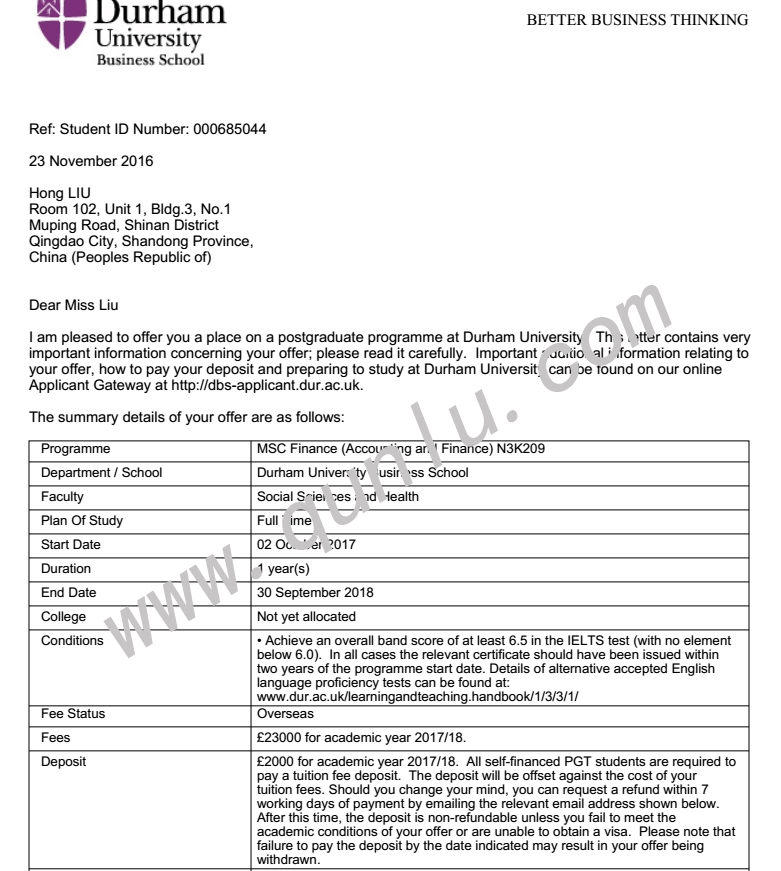 • 录取结果: University of Durham;University of Glasgow;University of Warwick