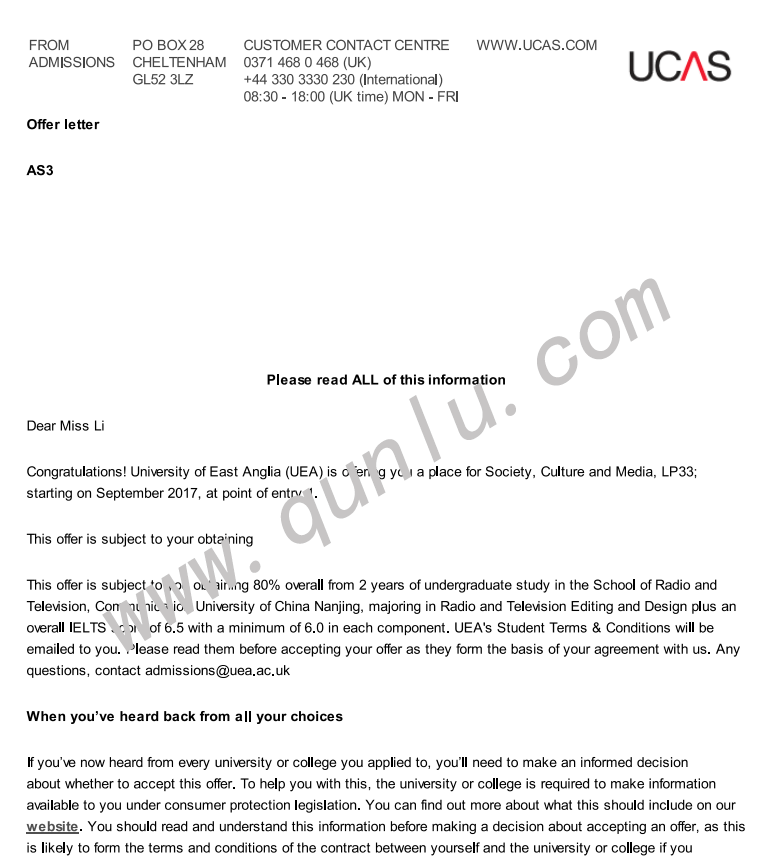 • 案例简介: 于University of Leicester,读AF专业,并以均分63.5分的成绩获得两所学校的offer