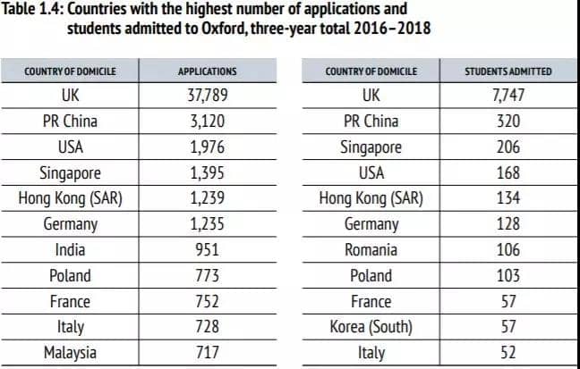 中国学生在牛津国际学生中所占比例最高。在2016-2018三年间,共有3,120名来自中国大陆的学生申请就读,其中320位学生获得最终录取,以下为该校按照国别招生数据: