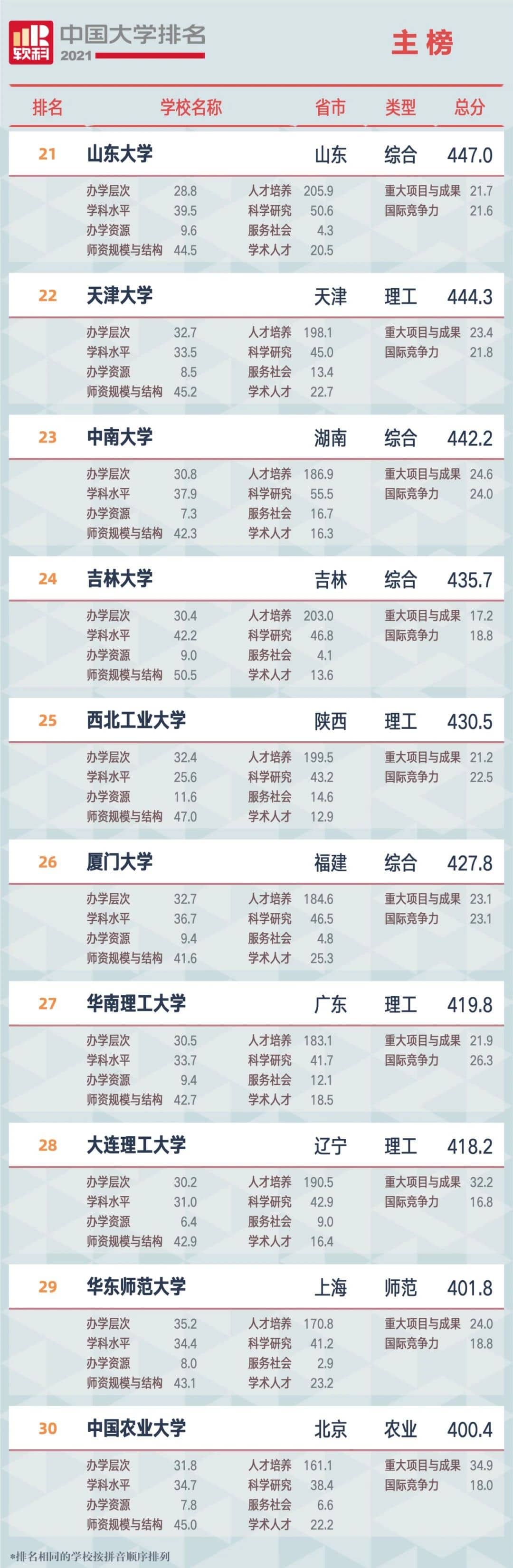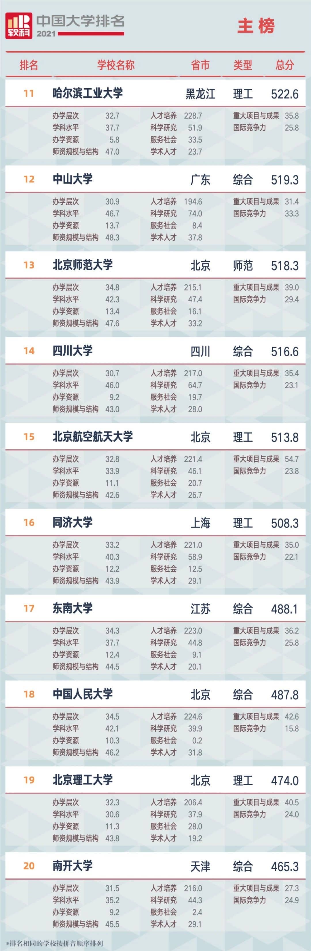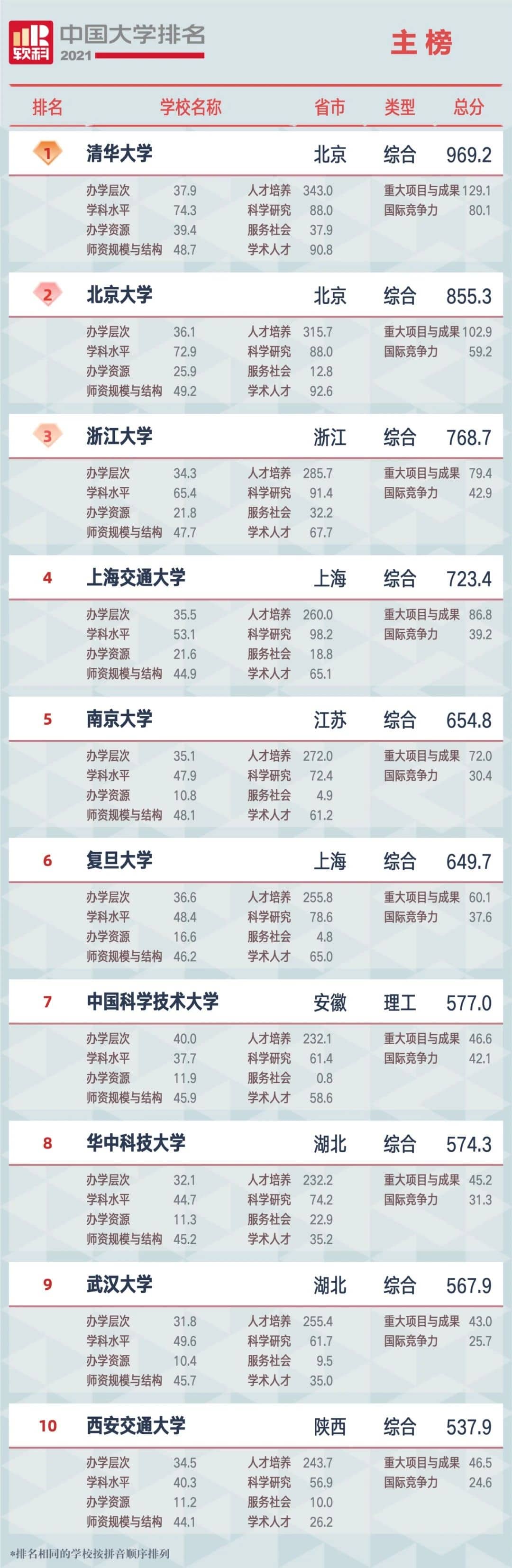 2021软科中国大学排名(主榜)的上榜高校共有582所,清华大学、北京大学、浙江大学占据前三,上海交通大学、南京大学位列全国前五。其他位列全国前十名的大学依次为复旦大学(第六)、中国科学技术大学(第七)、华中科技大学(第八)、武汉大学(第九)、西安交通大学(第十)。西安交通大学相较2020年排名上升1名,首次入围全国十强。西安交通大学坚持“扎根西部、服务国家、世界一流”的办学定位,建设世界一流研究型大学的愿景已现曙光。
