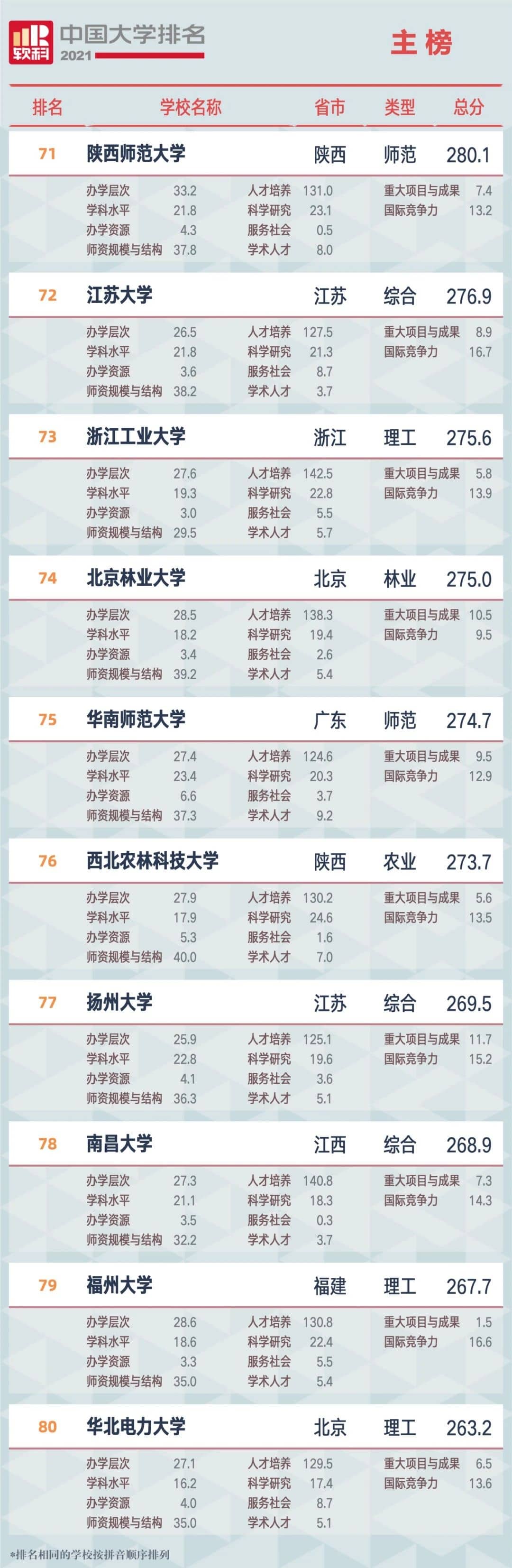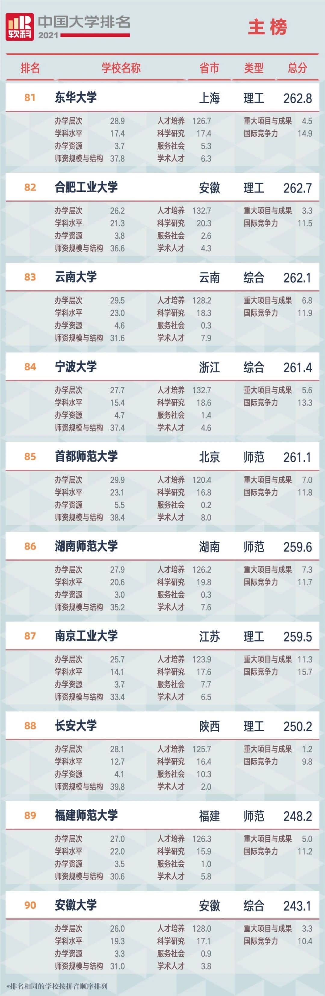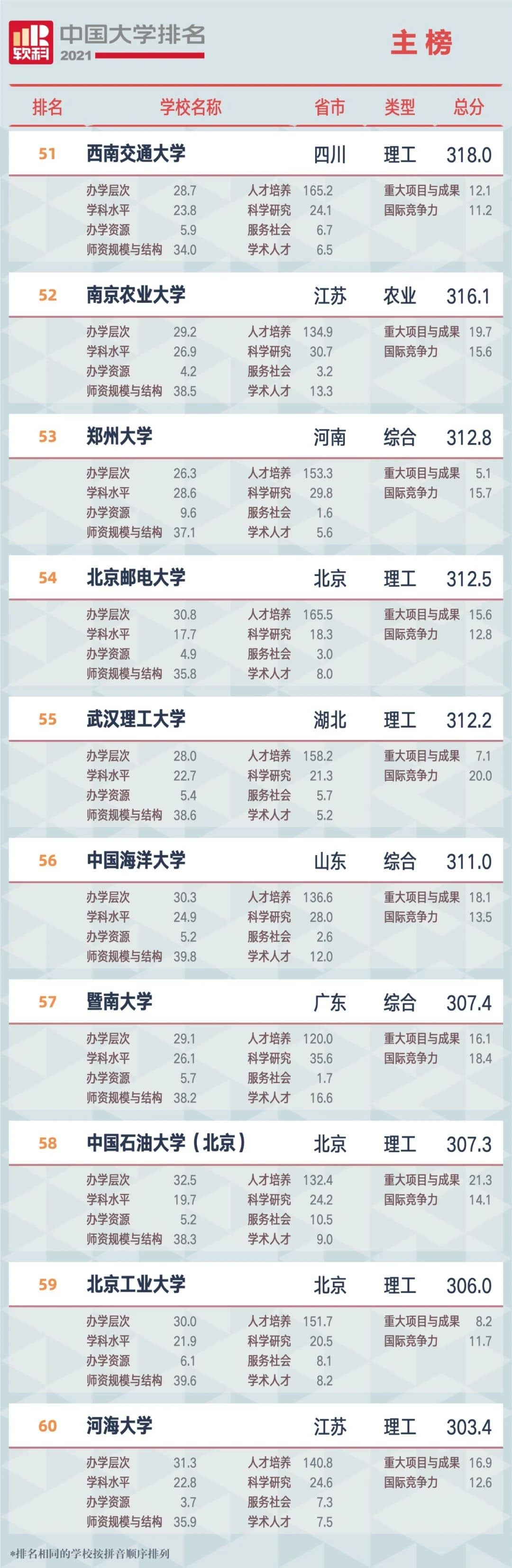 2021软科中国大学排名(主榜)的上榜高校共有582所,清华大学、北京大学、浙江大学占据前三,上海交通大学、南京大学位列全国前五。其他位列全国前十名的大学依次为复旦大学(第六)、中国科学技术大学(第七)、华中科技大学(第八)、武汉大学(第九)、西安交通大学(第十)。西安交通大学相较2020年排名上升1名,首次入围全国十强。西安交通大学坚持“扎根西部、服务国家、世界一流”的办学定位,建设世界一流研究型大学的愿景已现曙光。