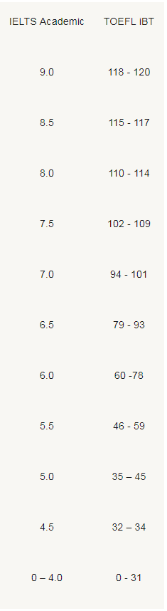 先前ETS发布的研究报告《Linking TOEFL iBT Scores to IETSScores: A Research Paper》,指明了TOEFL与IELTS在总分与单项上的分数对应关系。这份报告一共收集了1153份有效数据,通过对其分析,给出了这个转换表,供各位纠结于考托福、考雅思和参考各校录取信息要求的同学们作为参照。